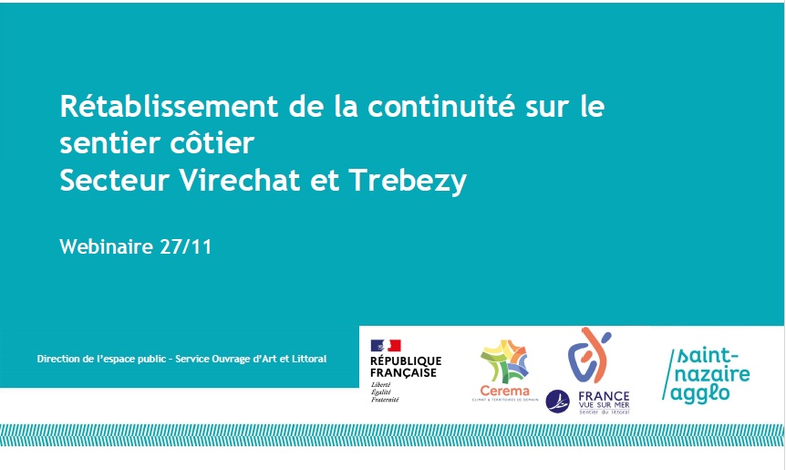 <p><strong>Les travaux du projet de "rétablissement de continuité du sentier côtier sur les secteurs Trébezy et Virechat</strong> ", projet lauréat de "France vue sur mer", sont achevés. La visite terrain du matin a permis de découvrir les deux nouvelles passerelles rétablissant la continuité du sentier du littoral pour le plus grand bonheur des habitants et des visiteurs. Cette matinée était suivie d'un déjeuner convivial et du webinaire flash, animé par Stéphane <strong>LE NAOUR</strong>, gestionnaire d'Ouvrages d'Art et Littoral à Saint-Nazaire Agglomération.</p>